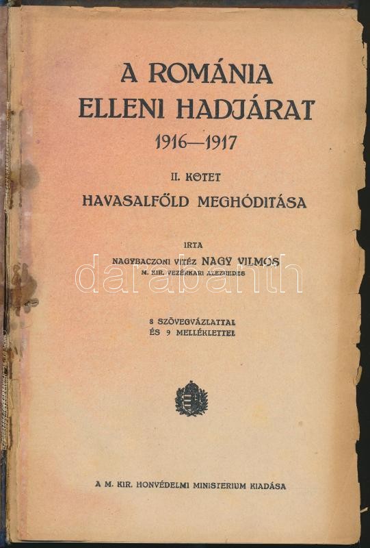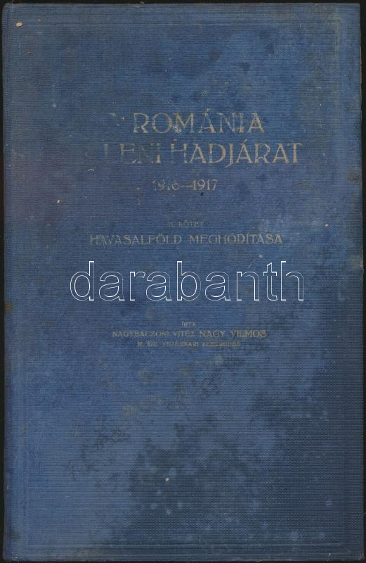 vitéz nagybaczoni Nagy Vilmos: A Románia elleni hadjárat 1916-1917. II. kötet. Havasalföld meghódítása. 9 melléklettel (6-8. hiányzik) Budapest, 1922. M. Kir. Honvédelmi Minisztérium kiadványa Fráter és társa. Egészvászon kötésben (kissé ázott)