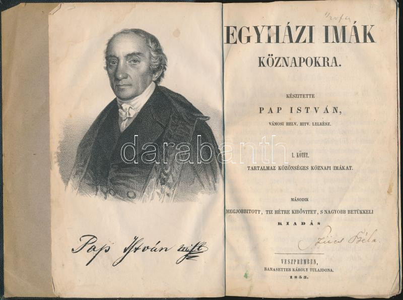 Pap István: Egyházi imák köznapokra, I. köt. Második megjobbitott, tiz hétre kibővitet, s nagyobb betükkeli kiadás. Veszprém, 1853, Ramasetter Károly. Bőrbe újrakötve, jó állapotban