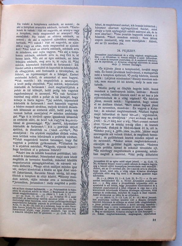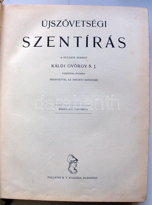 Újszövetségi Szentírás a Vulgata szerint Káldi György fordításában, Palladis Rt, 1928. 20 művészies, rézkarcszerű képpel, kissé laza egészvászon kötésben kis hibával