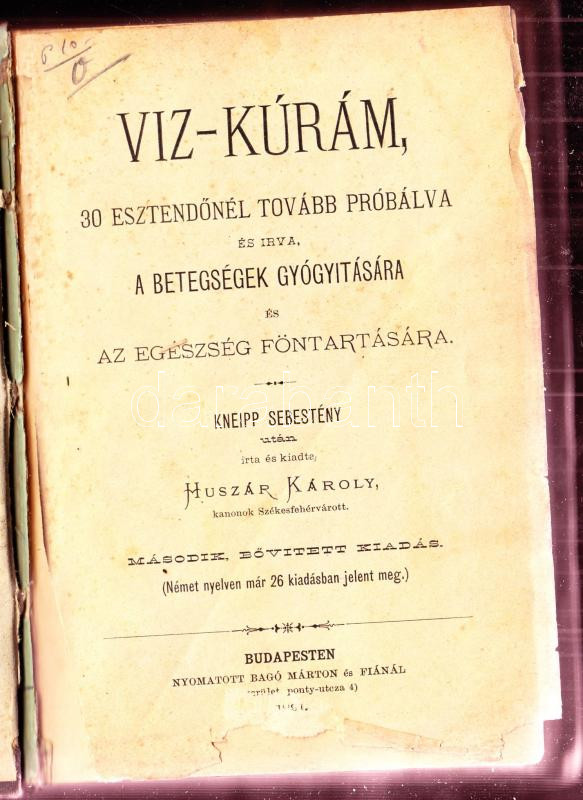 Huszár Károly: Vízkurám, melyet több mint 30 éves tapasztalat alapján kipróbálva és a betegségek gyógyítása és az egészség föntartására Kneip Sebestyén után. Bp., 1891 Bagó Márton. Első lap hibás