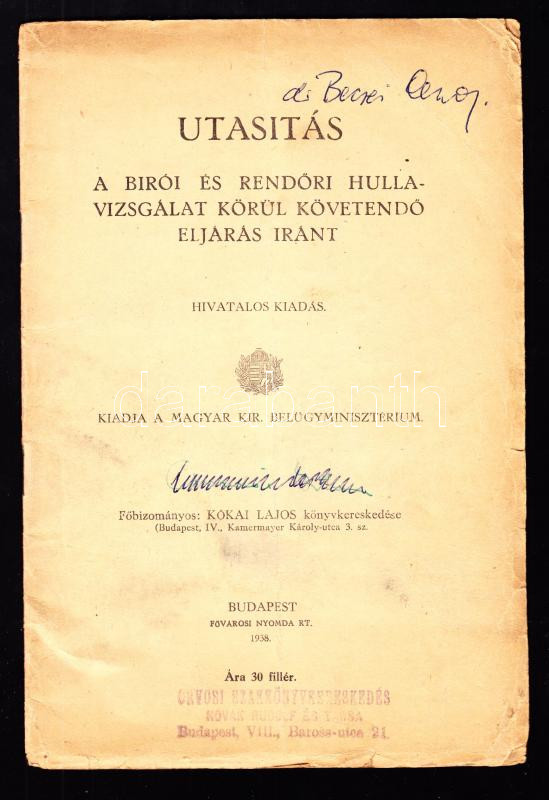 Utasítás a bírói és rendőri hullavizsgálat körül követendő eljárás iránt. Hivatalos kiadás. Kiadja a Magyar Kir. Belügyminisztérium. Bp, 1938, Fővárosi Nyomda Rt, p40. (Néhol tollal írt jegyzetekkel)