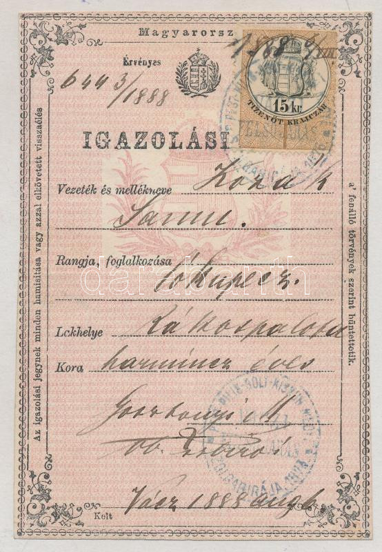 1888 Igazolási jegy lókupec részére / Id https://www.darabanth.com/de/162-Fernauktion/162.0/Andere-Sammelgebiete/Dokument~1000004/1888-Igazolasi-jegy-lokupec-reszere-Id~II524184