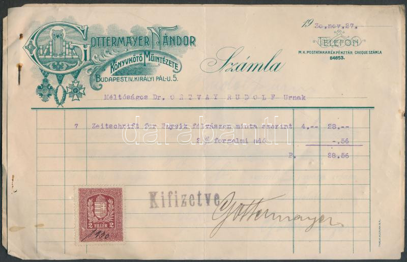 Beschreibung: 1930 Gottermayer Nándor könyvkötö fejléces számla a mester aláírásával