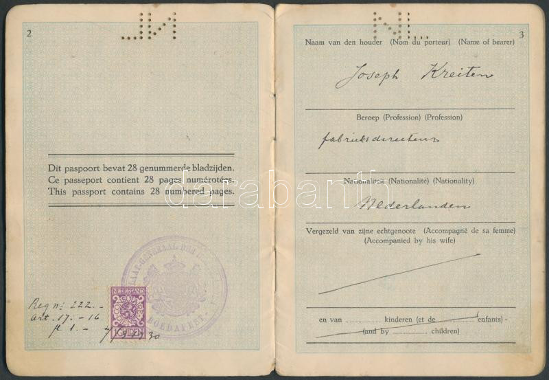 1930 Holland fényképes útlevél magyar illetékbélyegekkel https://www.darabanth.com/de/162-Fernauktion/162.0/Andere-Sammelgebiete/Dokument~1000004/1930-Holland-fenykepes-utlevel-magyar-illetekbelyegekkel~II524890
