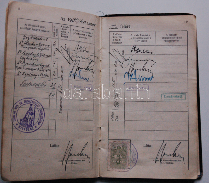 Beschreibung: 1936-1944 Joghallgatói egyetemi index a Miskolci Jogakadémiáról, neves jogászok aláírásával