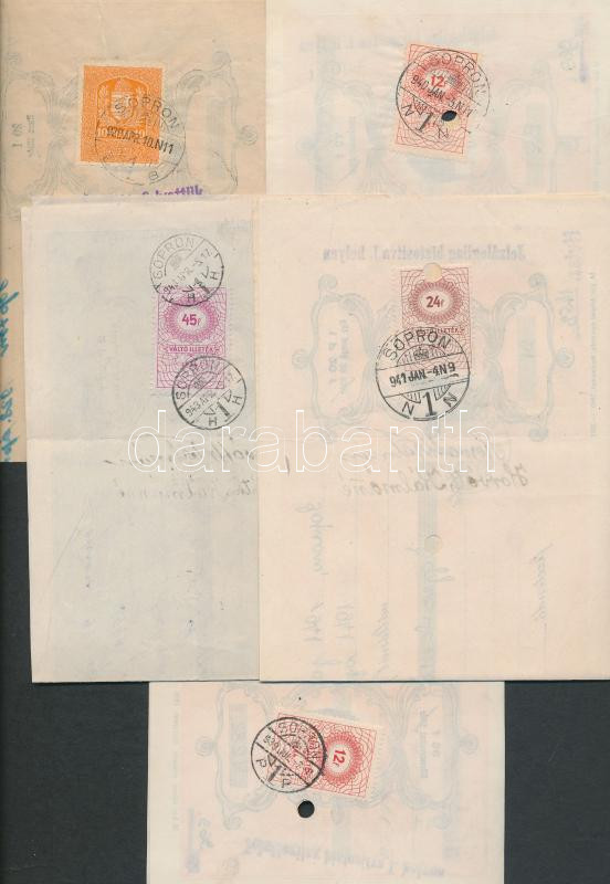 Beschreibung: 8db klf váltójegy illetékbélyegekkel