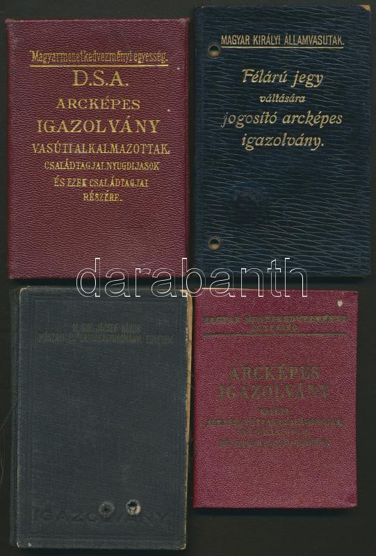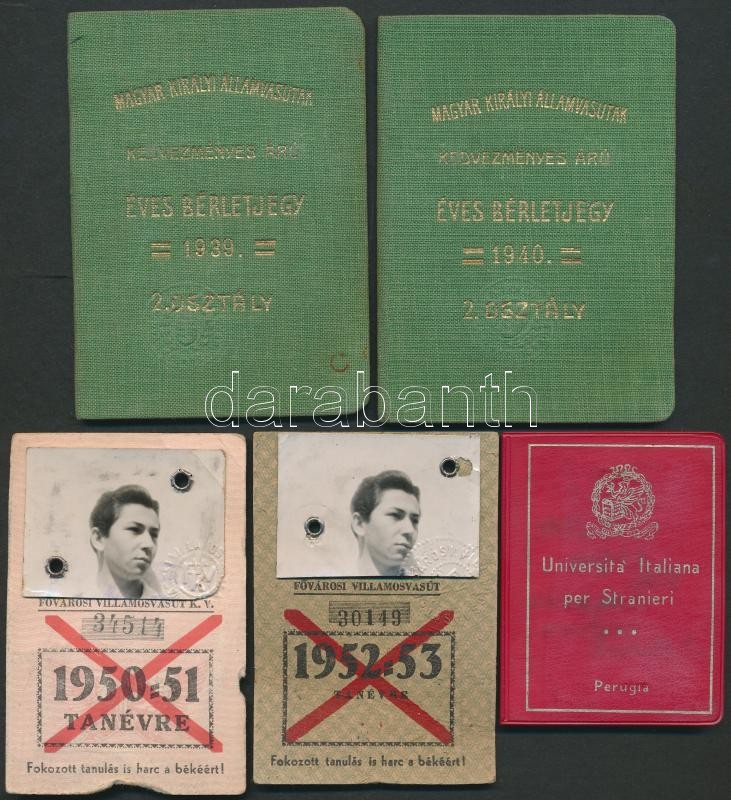 Okmány tétel: 8db fényképes vasúti és villamosbérlet (1922-1975), egy 1940/41-es fényképes diákigazolvány a Műszaki Egyetemről, és egy behívóparancs 1985-ből