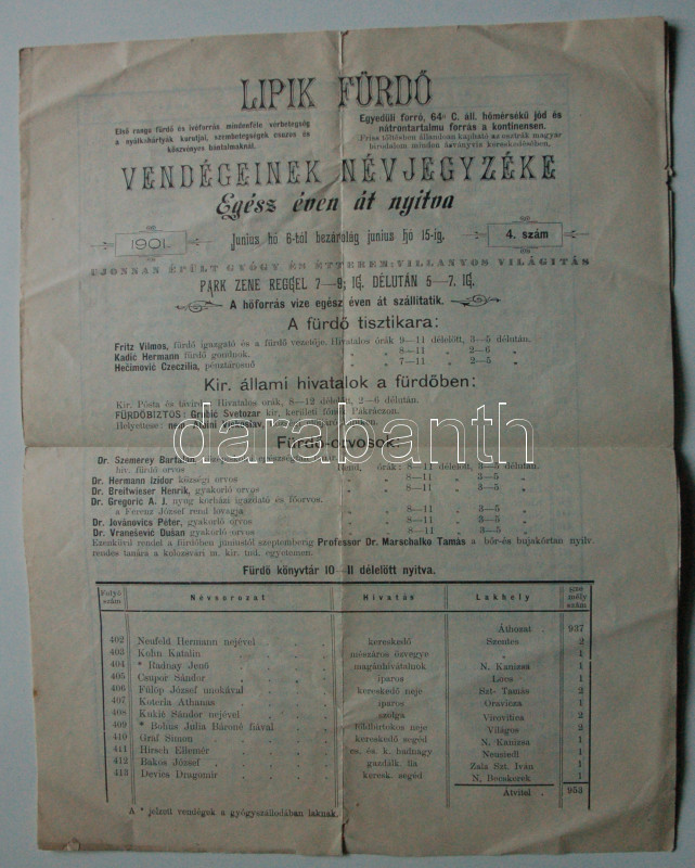 1901 Lipik-fürdő vendégeinek névjegyzéke (szakadások) / List of guests... https://www.darabanth.com/de/162-Fernauktion/162.0/Andere-Sammelgebiete/Drucksachen~1000146/1901-Lipik-furdo-vendegeinek-nevjegyzeke-szakadasok-List-of-guests-of-Lipik~II525364