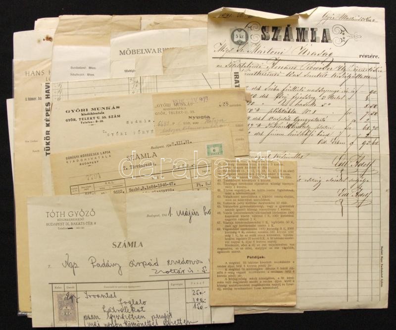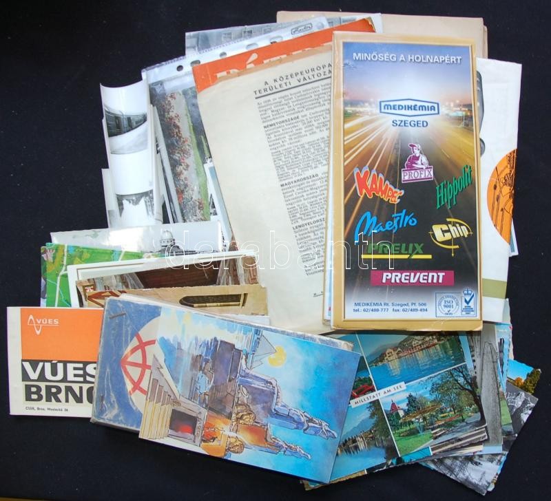 Nagy vegyes papírrégiség tétel: térkép, képeskönyv, kártyanaptár, menetrend, fotók, árverési katalógusok, képregények, számlák, bírságoló határozat, stb.