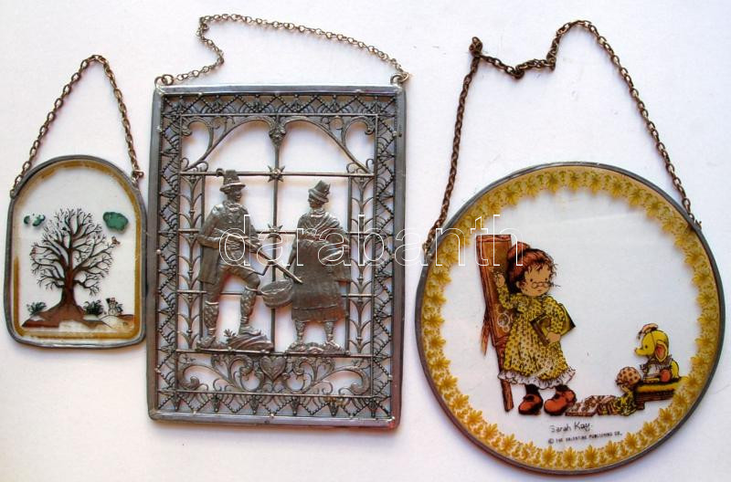 1db vadászjelenetet ábrázoló ablakba akasztható ólomkép és 2db festett üveg ablakdísz mesejelenettel /
