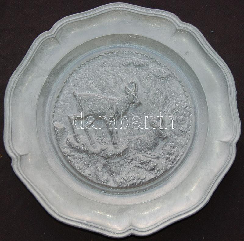 Beschreibung: Vadászjelenetet ábrázoló jelzett ón dísztányér /