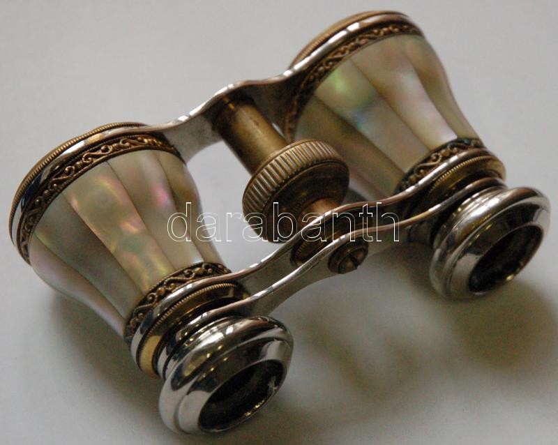 cca 1900 Kis réz színházi látcső gyöngyházberakással és arabeszk díszítéssel (a lencse foglalatán enyhe ütésnyomok) /