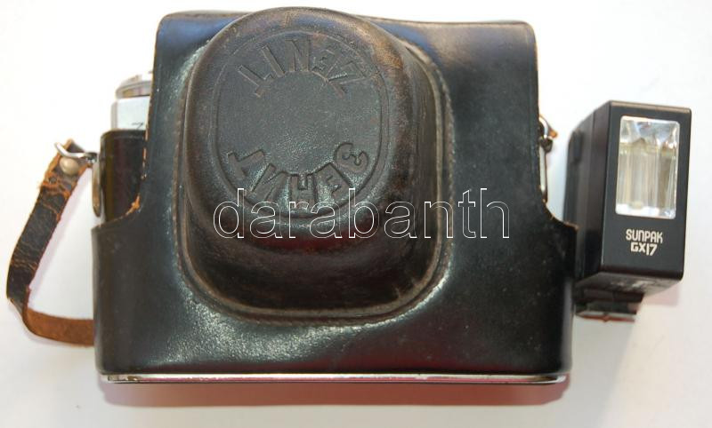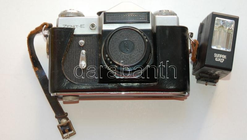Zenit-E típusú fényképezőgép Industar 50-2 3,5/50 objektívvel és Sunpak GX17 típusú vakuval saját tokjában /