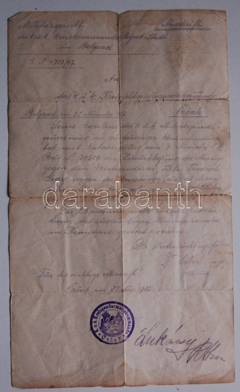1917 A cacaki tábori csendőrszázad levele a belgrádi hadbíróságnak pecséttel (szakadt) / Letter of the Cacak war gendarme-command to the Belgrade military court (damaged)