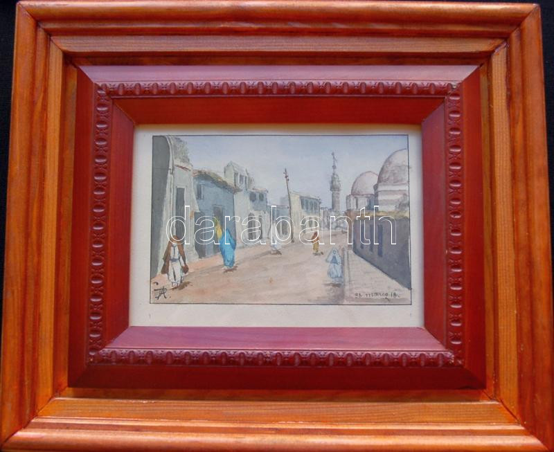 Beschreibung: Petrik Albert (1876-1916): Arab utcarészlet, ceruza-akvarell-papír, jelzett, 17x12cm, üvegezett keretben