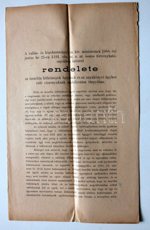 1888 Rendelet az izraelita hitközségek ügyeinek és az anyakönyvi ügyhe... https://www.darabanth.com/de/162-Fernauktion/162.0/Andere-Sammelgebiete/Judaica~1000012/1888-Rendelet-az-izraelita-hitkozsegek-ugyeinek-es-az-anyakonyvi-ugyhez-valo-viszonyuknak-szab~II524495