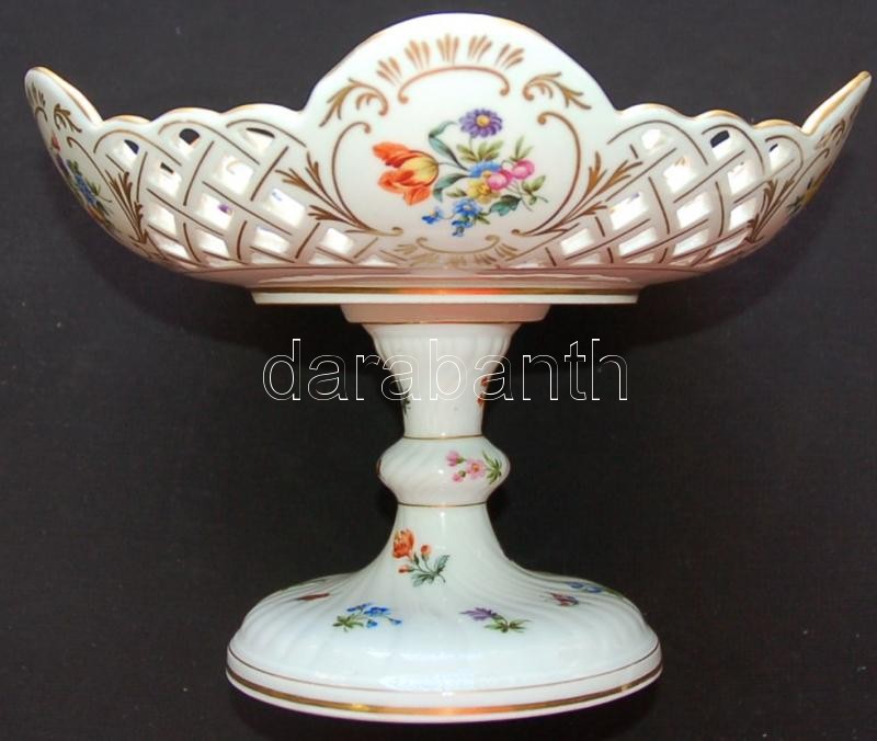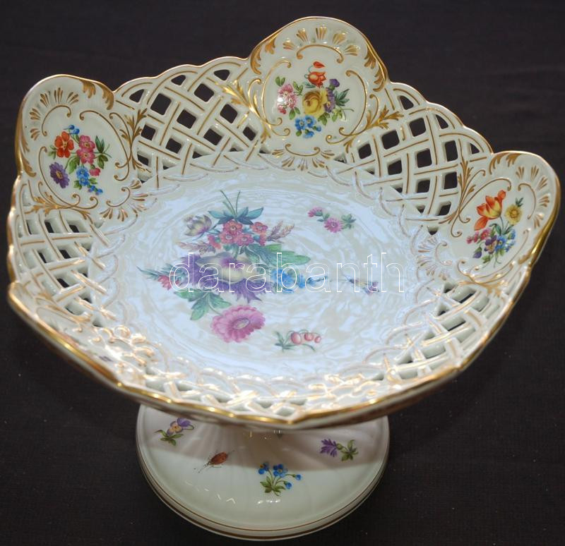 ~1890 Csodálatos, sorszámozott, kézzel festett és aranyozott, Bouquet de Saxe-mintás, áttört, jelzett Herendi gyümölcsös tál hibátlan állapotban /