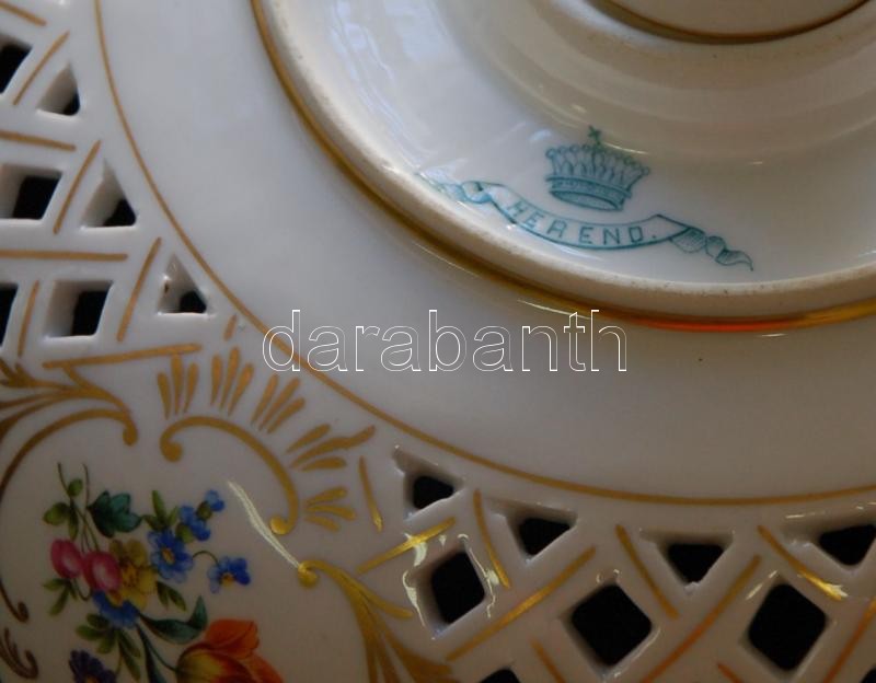Wonderful numbered handpainted and gold plated pierced Herendi chinaware fruit bowl in flawless condition 17x24cm