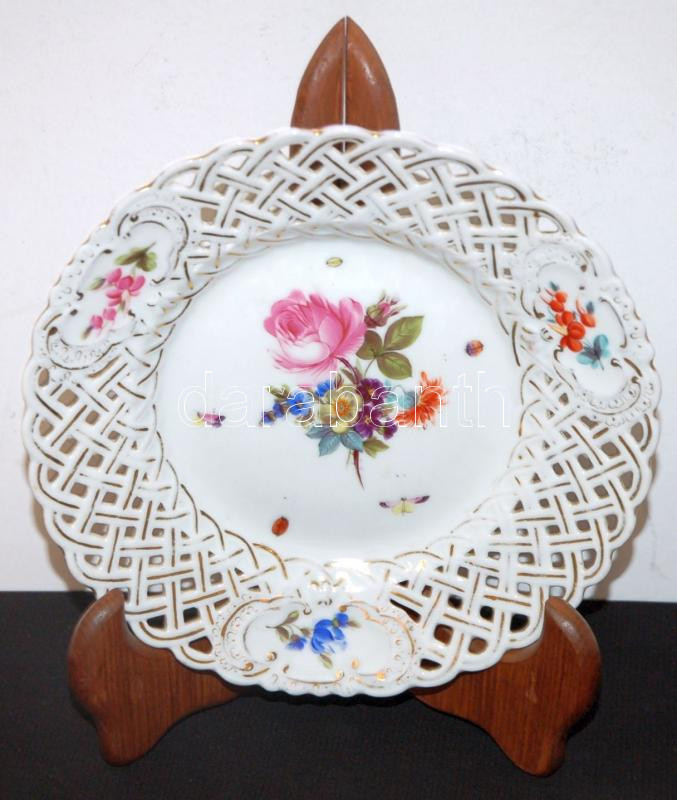 Handpainted and golded numbered pierced Herendi chinaware bowl in flawless condition with wooden stand d: 21cm