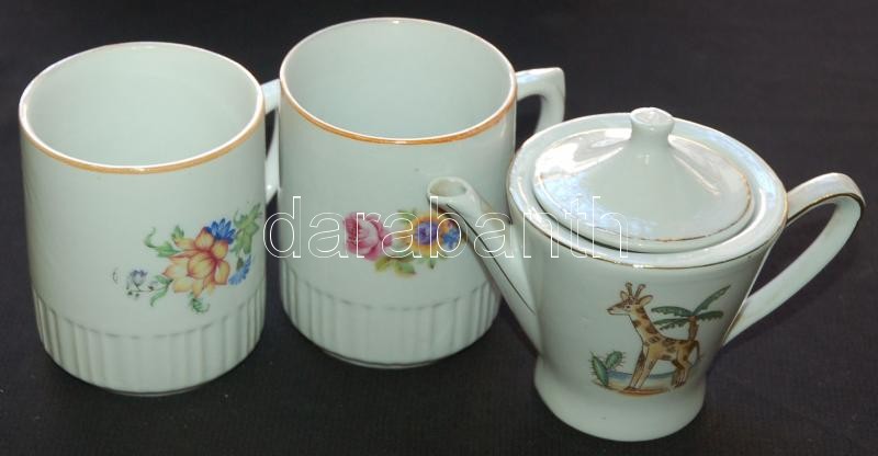 Beschreibung: Kis vegyes porcelán tétel: 6db jelzett teáscsésze, 9db jelzett süteményes tányér, 2db bögre és egy kiöntő /