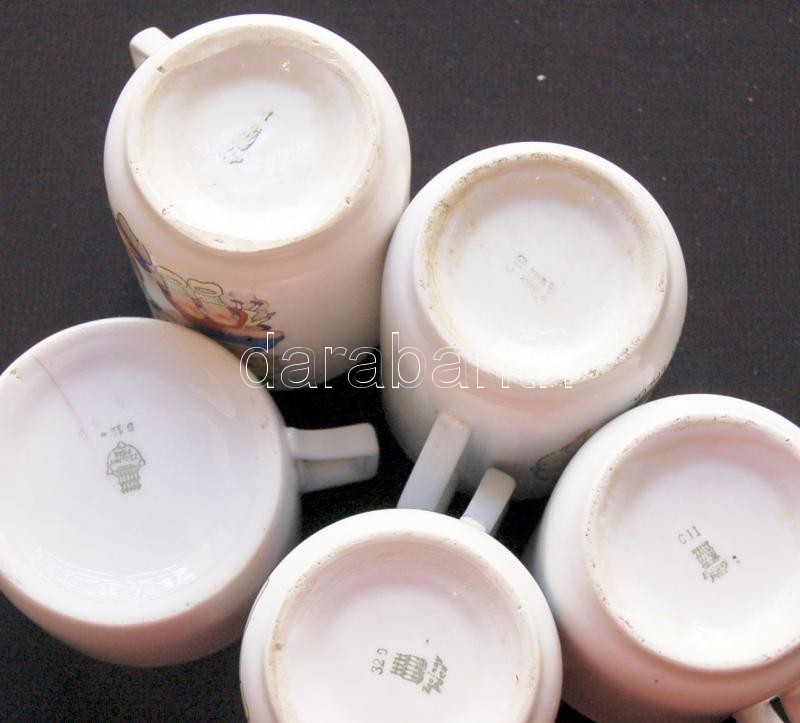Beschreibung: Vegyes Zsolnay porcelán tétel: 7db süteményes tányér, 4db kávécsésze-alátét, 4db bögre, 1db teáscsésze, mind jelzett /