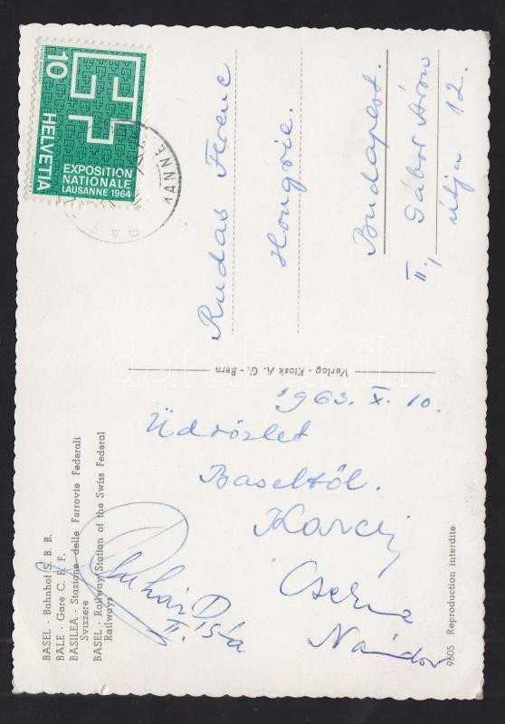 Beschreibung: 1969 Lakat Károly, Juhász István és Cserna Nándor FTC labdarúgók aláírása svájci képeslapon