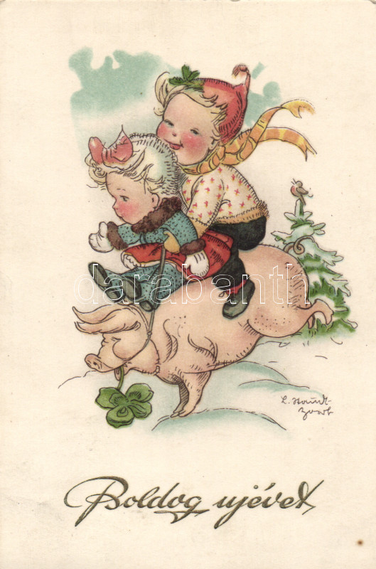 New Year, children ride a pig, artist signed https://www.darabanth.com/de/162-Fernauktion/162.0/Ansichtskarten/GruC39Fkarte~1000119/New-Year-children-ride-a-pig-artist-signed~II525671