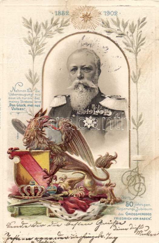 Friedrich von Baden 50th anniversary, Bavarian patriotic Emb. litho https://www.darabanth.com/de/162-Fernauktion/162.0/Ansichtskarten/Herrscher-Politiker~1000118/Friedrich-von-Baden-50th-anniversary-Bavarian-patriotic-Emb-litho~II525758