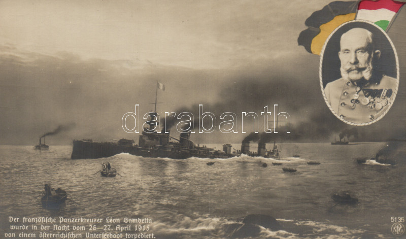 French cruiser Gambetta shot by a K.u.K. torpedo ship; Franz Joseph https://www.darabanth.com/de/162-Fernauktion/162.0/Ansichtskarten/Kriegsschiff~1000092/French-cruiser-Gambetta-shot-by-a-KuK-torpedo-ship-Franz-Joseph~II525509