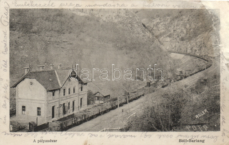 Bóli-barlang, railway station, Divald & Monostory (wet damage) https://www.darabanth.com/de/162-Fernauktion/162.0/Ansichtskarten/Siebenburgen~500006/Boli-barlang-railway-station-Divald-Monostory-wet-damage~II526637