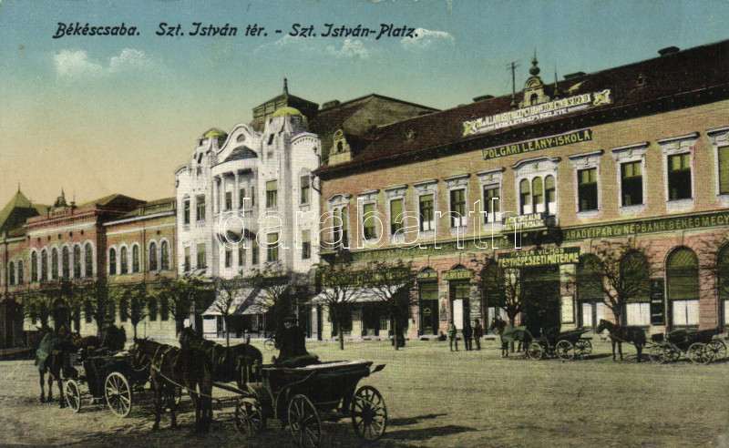 Beschreibung: Békéscsaba Szent István tér, Polgári leányiskola, Áruforgalmi részvénytársaság, Maider Vilmos fényképészeti műterme