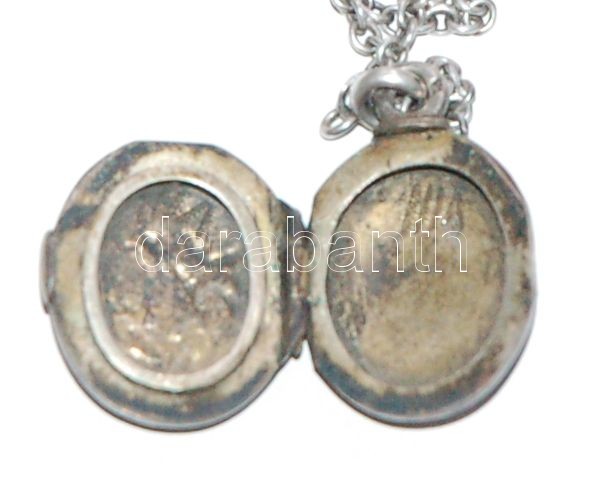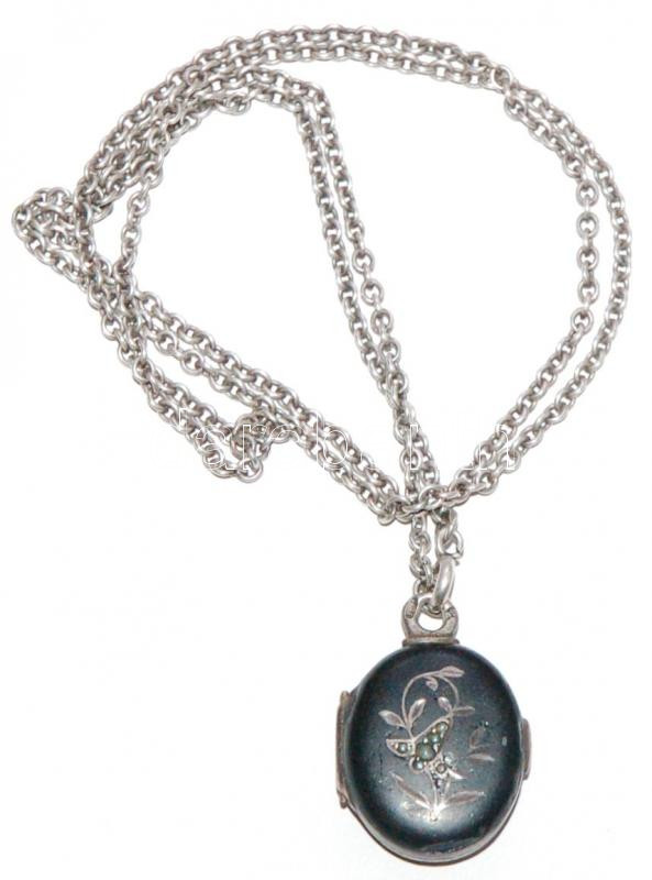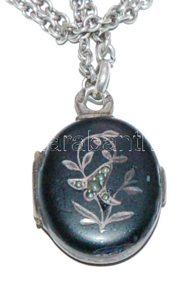 Antik ezüst nyaklánc apró fénykép tartására szolgáló gyász-medállal. A medálon 6 db apró gyönggyel. Br: 15g /