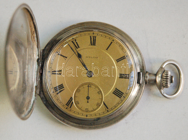 cca 1900 Különlegesen vékony, duplafedelű, ezüst (Ag) Seeland zsebóra svájci 800-as tisztaságjelzéssel, német hold-korona jelzéssel és az Osztrák-Magyar Monarchia behozatali jegyével ellátva. Kiválóan működik /