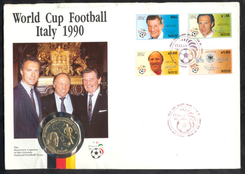 Niue 1990. 5$ "Labdarúgó VB - Olaszország" érmés borítékon teljes bélyegsorral, elsőnapi bélyegzéssel, hátoldali ismertetővel T:BU