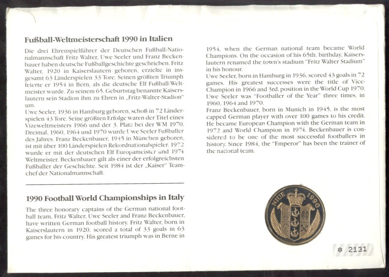 Niue 1990. 5 Dollars "Football World Championship Italy 1990" coin letter with first day of issue stamps and information C:Unc
