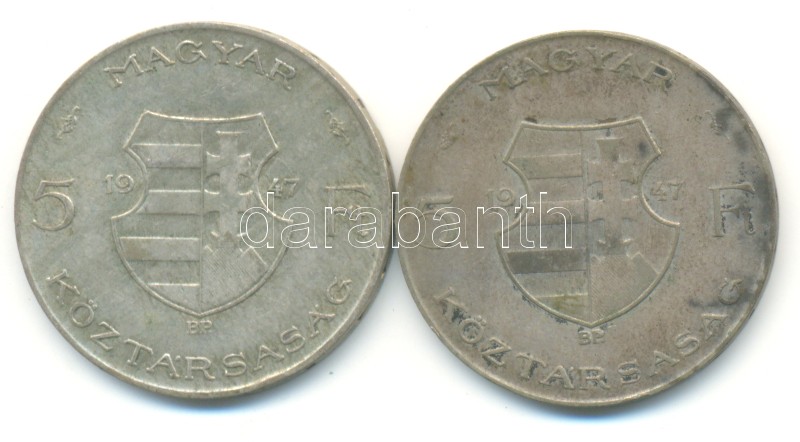 1947. 5Ft Ag "Kossuth" (2x) T:3 https://www.darabanth.com/de/162-Fernauktion/162.0/Numismatik/Ungarische-Munzen~1000135/1947-5Ft-Ag-Kossuth-2x-T3~II515641