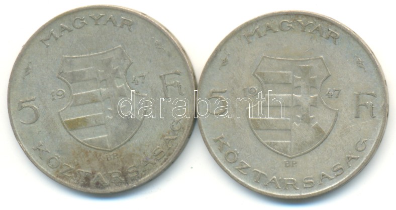 1947. 5Ft Ag "Kossuth" (2x) T:3 https://www.darabanth.com/de/162-Fernauktion/162.0/Numismatik/Ungarische-Munzen~1000135/1947-5Ft-Ag-Kossuth-2x-T3~II515643