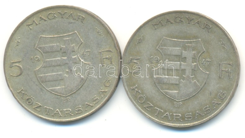 1947. 5Ft Ag "Kossuth" (2x) T:3 https://www.darabanth.com/de/162-Fernauktion/162.0/Numismatik/Ungarische-Munzen~1000135/1947-5Ft-Ag-Kossuth-2x-T3~II515644
