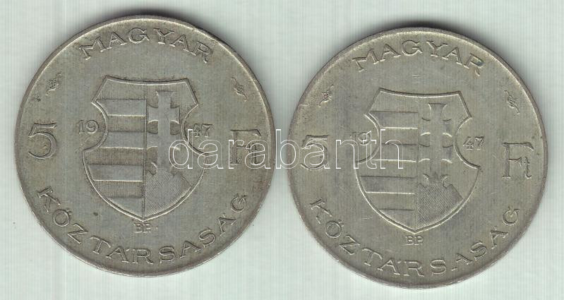 1947. 5Ft Ag "Kossuth" (2x) T:3 https://www.darabanth.com/de/162-Fernauktion/162.0/Numismatik/Ungarische-Munzen~1000135/1947-5Ft-Ag-Kossuth-2x-T3~II515672