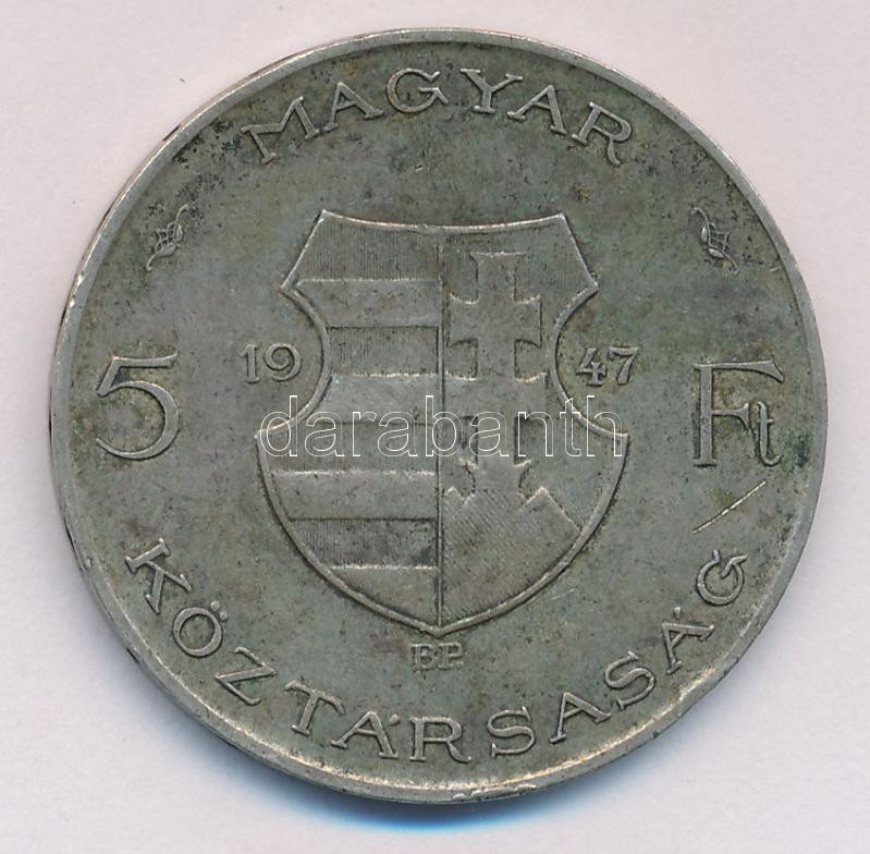 1947. 5Ft Ag "Kossuth" T:3 https://www.darabanth.com/de/162-Fernauktion/162.0/Numismatik/Ungarische-Munzen~1000135/1947-5Ft-Ag-Kossuth-T3~II524849