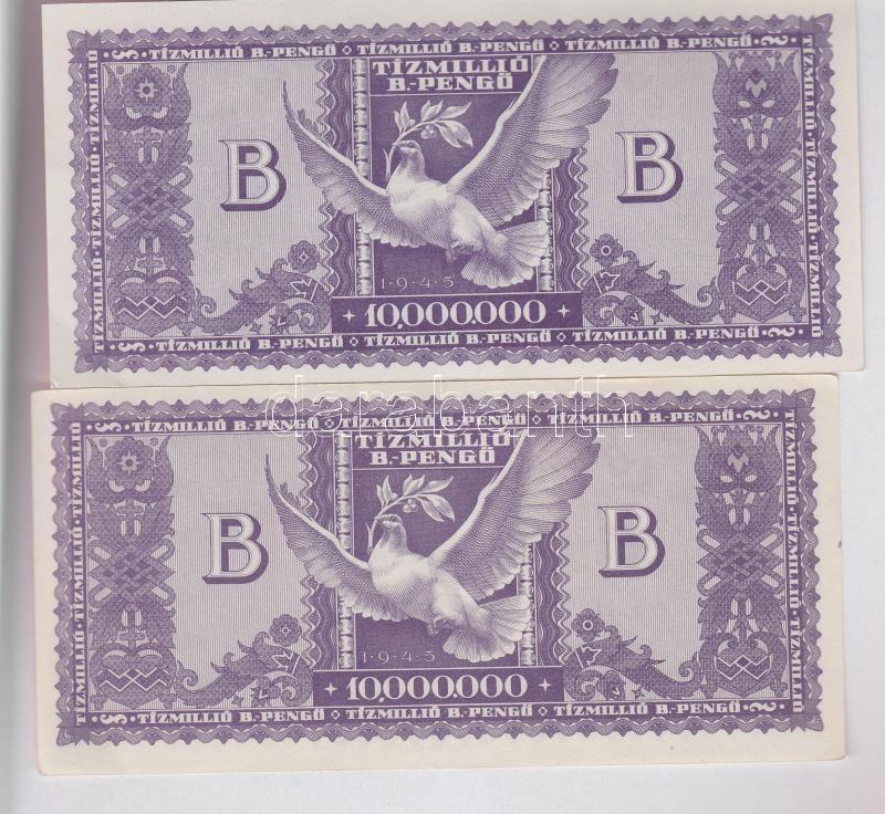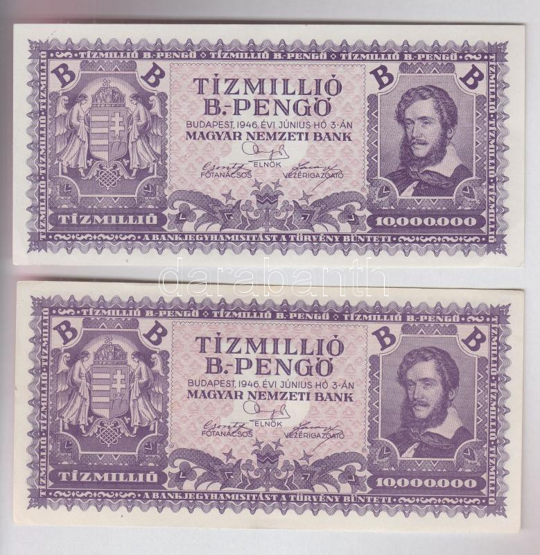 1946. 10.000.000BP (2x) T:I,I- https://www.darabanth.com/de/163-Fernauktion/163.0/Numismatik/Ungarische-banknoten~1600131/1946-10000000BP-2x-TI-I-~II530892