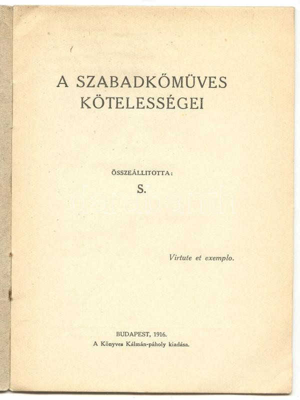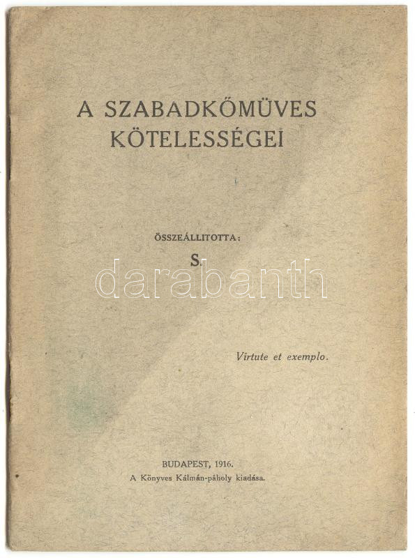 Szabadkőművesség: S: A szabadkőmüves kötelességei. Bp. 1916. Könyves K... https://www.darabanth.com/de/164-Fernauktion/164.0/Andere-Sammelgebiete/Bucher-Freimauer~500030/Szabadkomuvesseg-S-A-szabadkomuves-kotelessegei-Bp-1916-Konyves-Kalman-paholy-12p~II542088