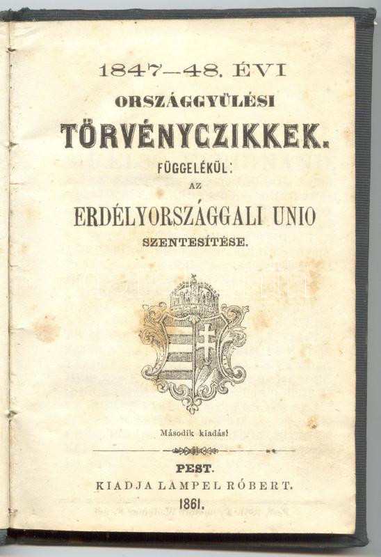 1847-48. évi országgyülési törvényczikkek. Függelékül az Erdélyországgali unio szentesítésére. Pest, 1861. Lampel. A tartalomjegyzékből 2 lap hiányzik. Korabeli hátán foltos aranyozott gerincű egészvászon kötésben