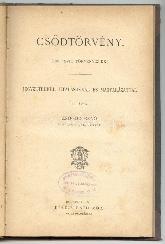 1881 Csődtörvény. Zsögöd Benő jegyzeteivel. + Igazságügyminiszteri ren... https://www.darabanth.com/de/164-Fernauktion/164.0/Andere-Sammelgebiete/Bucher-Geschichte~500029/1881-Csodtorveny-Zsogod-Beno-jegyzeteivel-plus-Igazsagugyminiszteri-rendeletek-Bp-1881-Rat~II538968