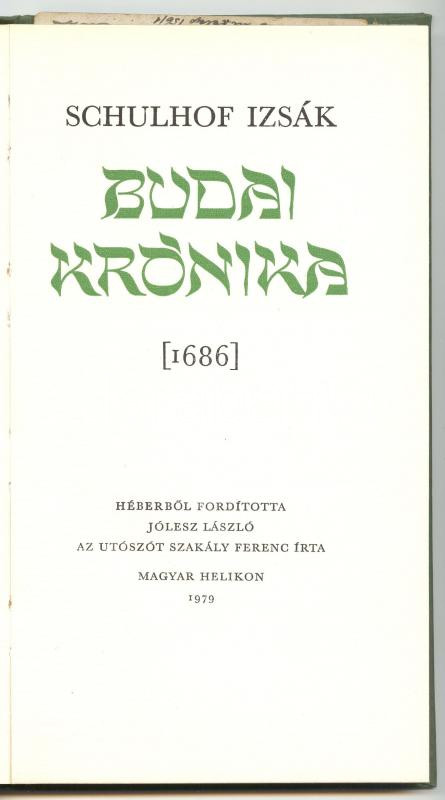 Schulhof Izsák: Budai krónika (1686). Bp., 1978 Magyar Helikon 100p. https://www.darabanth.com/de/164-Fernauktion/164.0/Andere-Sammelgebiete/Bucher-Judaica~500031/Schulhof-Izsak-Budai-kronika-1686-Bp-1978-Magyar-Helikon-100p~II542094