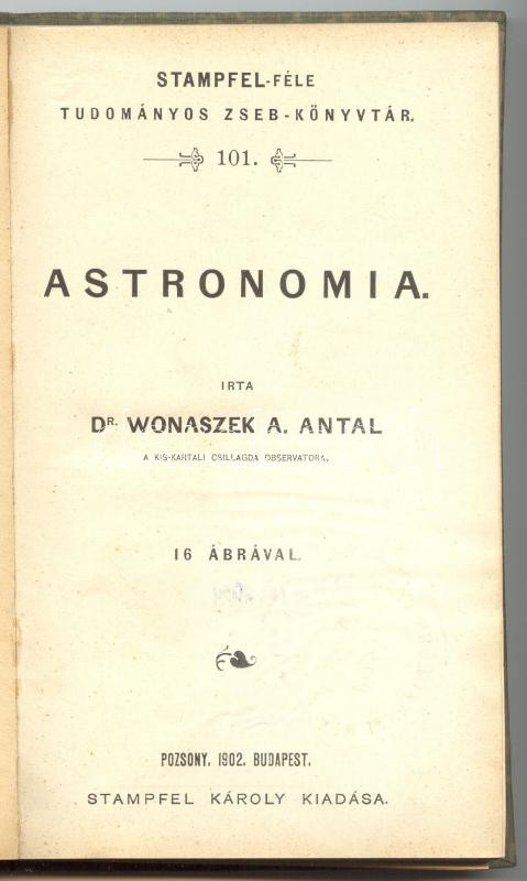 A Művelt Otthon Könyvtára: Csillagászattan. Benne egybekötve: Dr. Wonaszek A. Antal: Astronomia; Dr. Bozóky Endre: Kosmografia (A világegyetem rövid leírása), Kis meterologia. 61 ábra. Bp.-Pozsony, 1901-1902, Stampfel Károly. Kissé megviselt, kiadói egészvászon Gottermayer-kötésben, jó állapotban