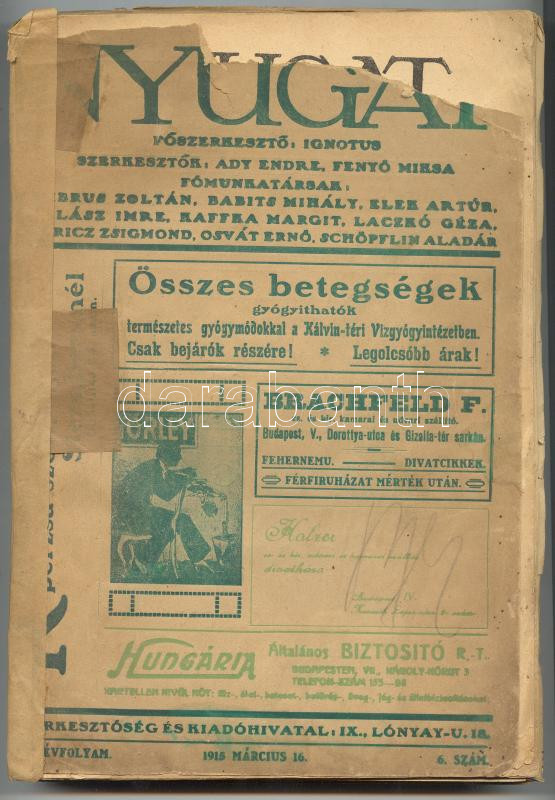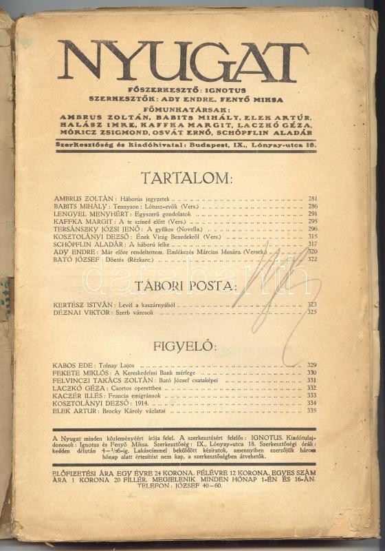 A nyugat 4 db száma egybekötve: 1916/6., 1917/6., 1917/22., 1924/7. Mi... https://www.darabanth.com/de/164-Fernauktion/164.0/Andere-Sammelgebiete/Bucher-Sonstige-Raritaten~500037/A-nyugat-4-db-szama-egybekotve-19166-19176-191722-19247-Mind-kisse-szakadozottak~II536853