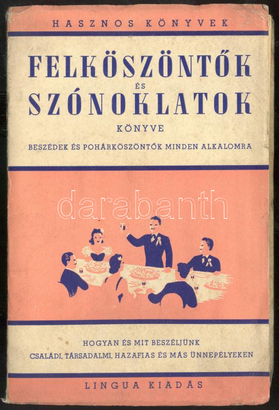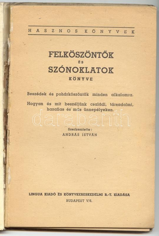 Felköszöntők és szónoklatok könyve. Beszédek és pohárköszöntők minden alkalomra: Hogyan és mit beszéljünk családi, társadalmi, hazafias és más ünnepélyeken. Szerk.: András István. Bp., é.n., Lingua. Kiadói kötésben, jó állapotban (a kötés félig levált)
