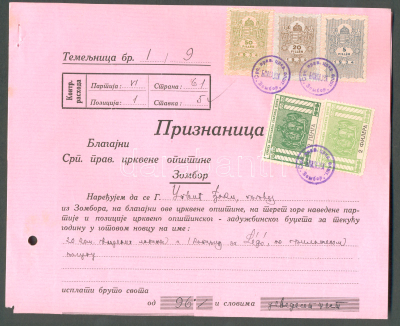 1943 Egyházi okmány Zomborról szerb egyházi adóbélyegekkel és magyar o... https://www.darabanth.com/de/164-Fernauktion/164.0/Andere-Sammelgebiete/Dokument~500015/1943-Egyhazi-okmany-Zomborrol-szerb-egyhazi-adobelyegekkel-es-magyar-okmanybelyegekkel~II538945