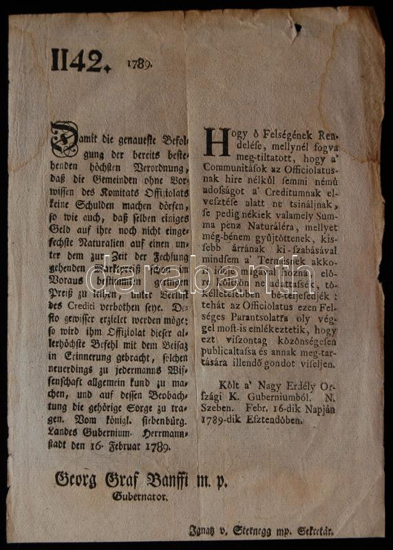 1789 Bánffi György erdélyi kormányzó 1142. számú körlevele https://www.darabanth.com/de/164-Fernauktion/164.0/Andere-Sammelgebiete/Drucksachen~500026/1789-Banffi-Gyorgy-erdelyi-kormanyzo-1142-szamu-korlevele~II516980